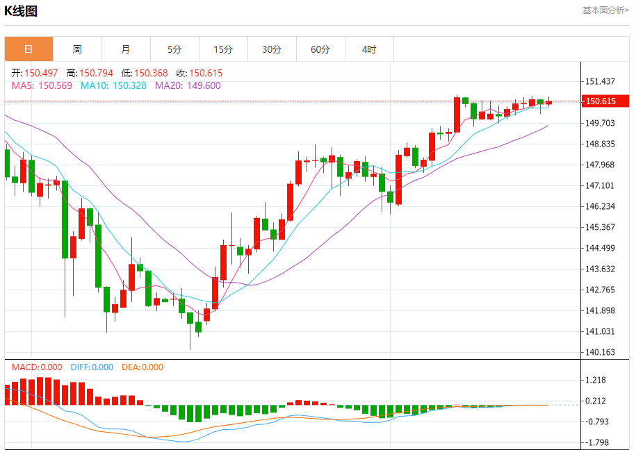 汇价高见150.794,低见150.368。上一交易日,汇价收于150.496。
