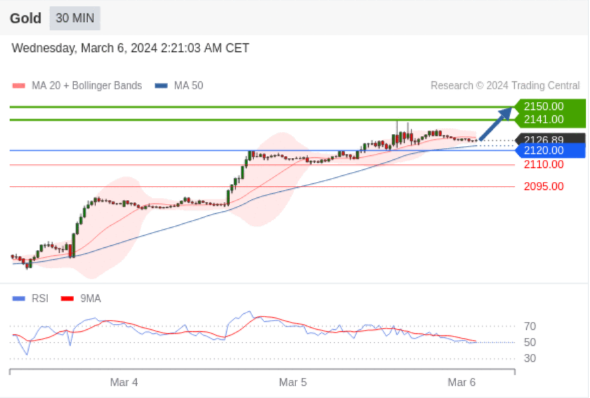 在 2120.00 之上,看涨,目标价位为 2141.00 ,然后为 2150.00 。