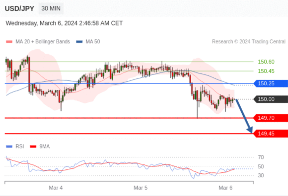在 150.25 之下,看跌,目标价位为 149.70 ,然后为 149.45 。