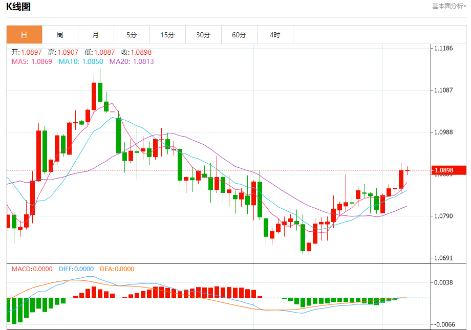 汇价高见1.0907,低见1.0887。上一交易日,汇价收于1.0898。