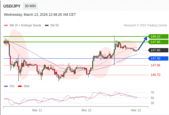 在 147.30 之上,看涨,目标价位为 147.90 ,然后为 148.10 。