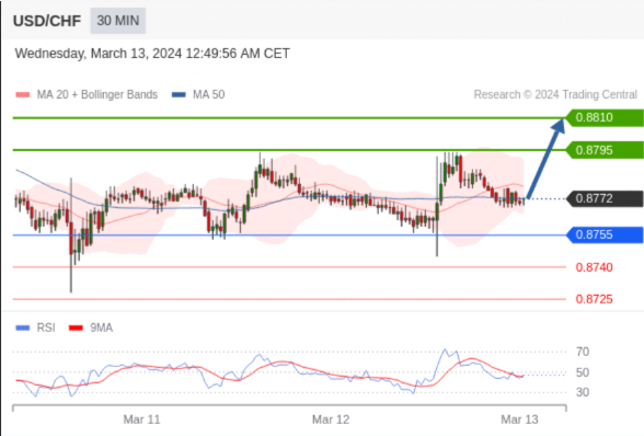 在 0.8755 之上,看涨,目标价位为 0.8795 ,然后为 0.8810 。