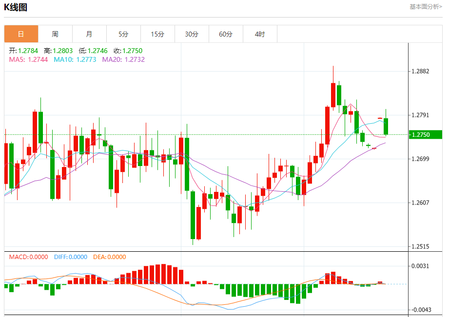 汇价高见1.2803,低见1.2746。上一交易日,汇价收于1.2785。