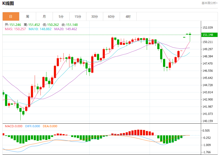 汇价高见151.452,低见150.258。上一交易日,汇价收于151.251。