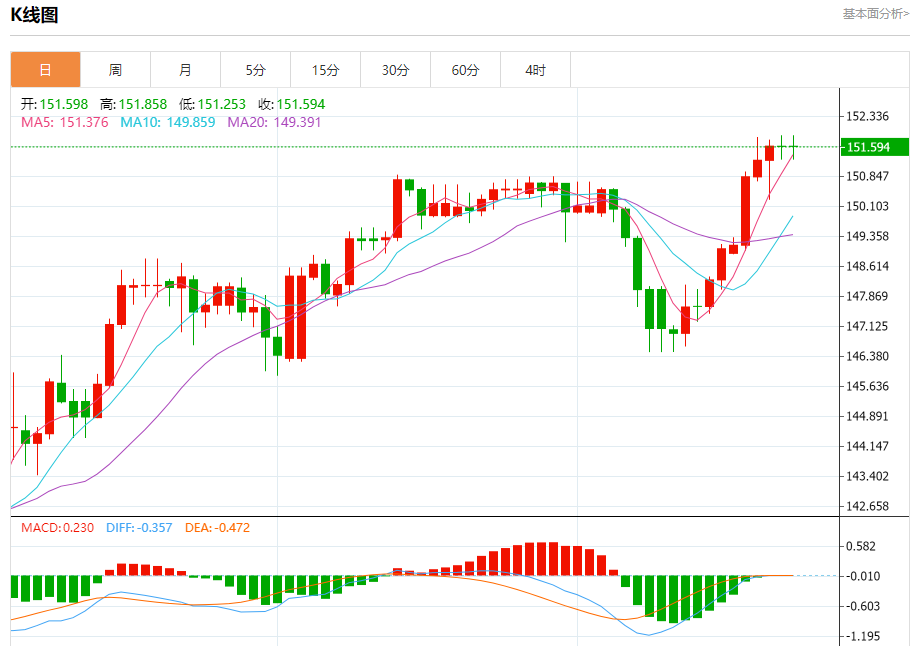 汇价高见151.858,低见151.253。上一交易日,汇价收于151.601。
