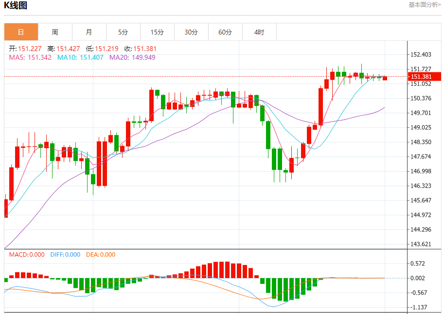 汇价高见151.427,低见151.219。上一交易日,汇价收于151.328。