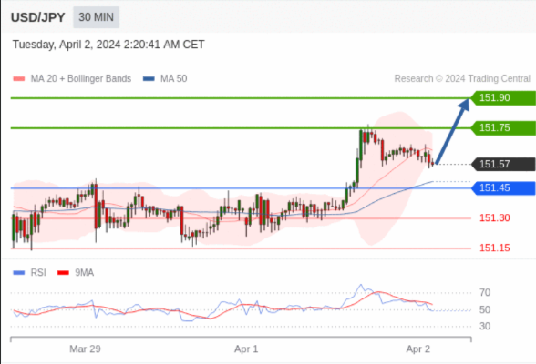 ÔÚ 151.45 Ö®ÉÏ£¬¿´ÕÇ£¬Ä¿±ê¼ÛλΪ 151.75 £¬È»ºóΪ 151.90 ¡£