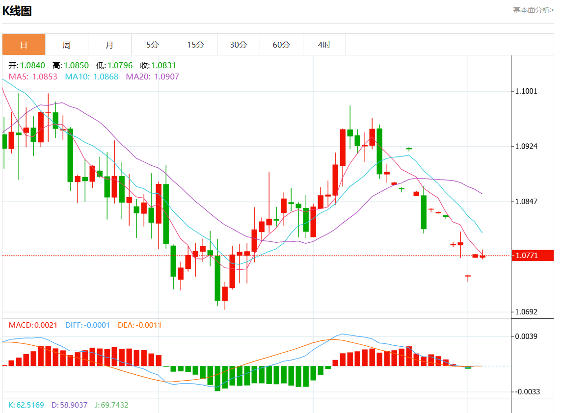 周三欧市盘中,欧元/美元最新报1.0770,日图涨0.01%.