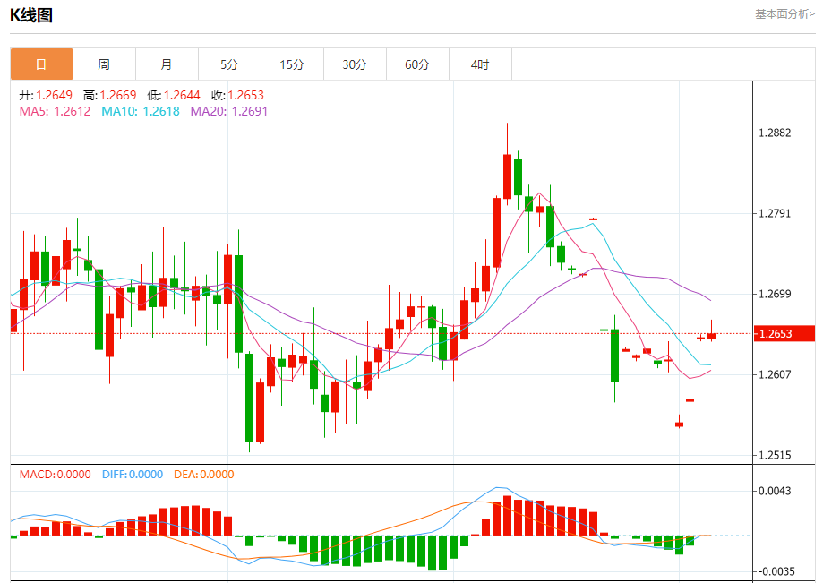 汇价高见1.2669,低见1.2644。上一交易日,汇价收于1.2652。