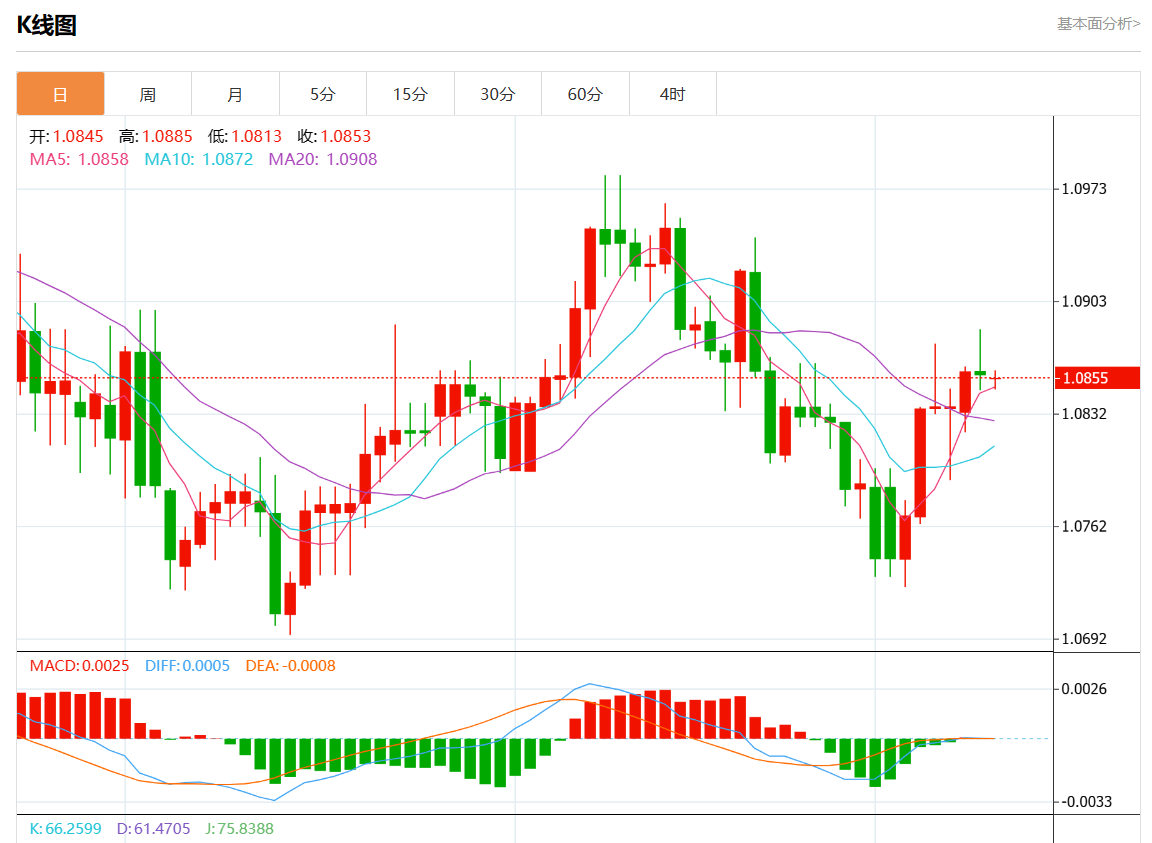 周三欧市盘中,欧元/美元最新报1.0852,日图跌0.05%.