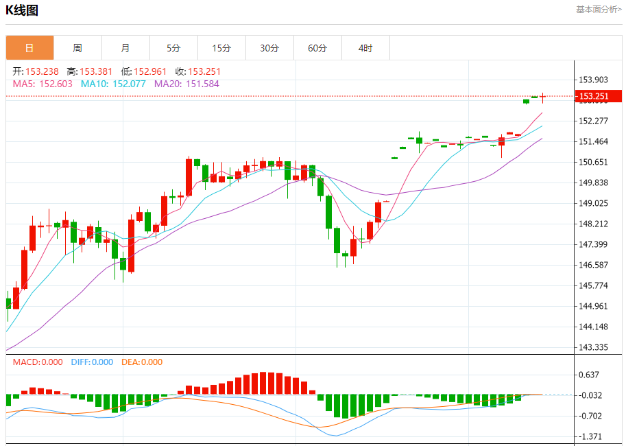 汇价高见153.381,低见152.961。上一交易日,汇价收于153.262。