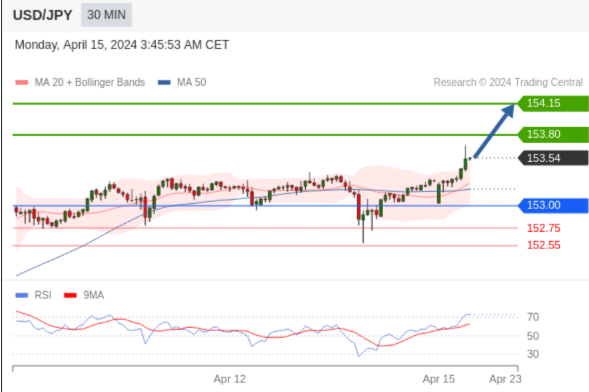 在 153.00 之上,看涨,目标价位为 153.80 ,然后为 154.15 。