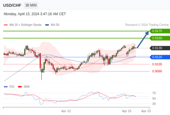 在 0.9120 之上,看涨,目标价位为 0.9160 ,然后为 0.9175 。
