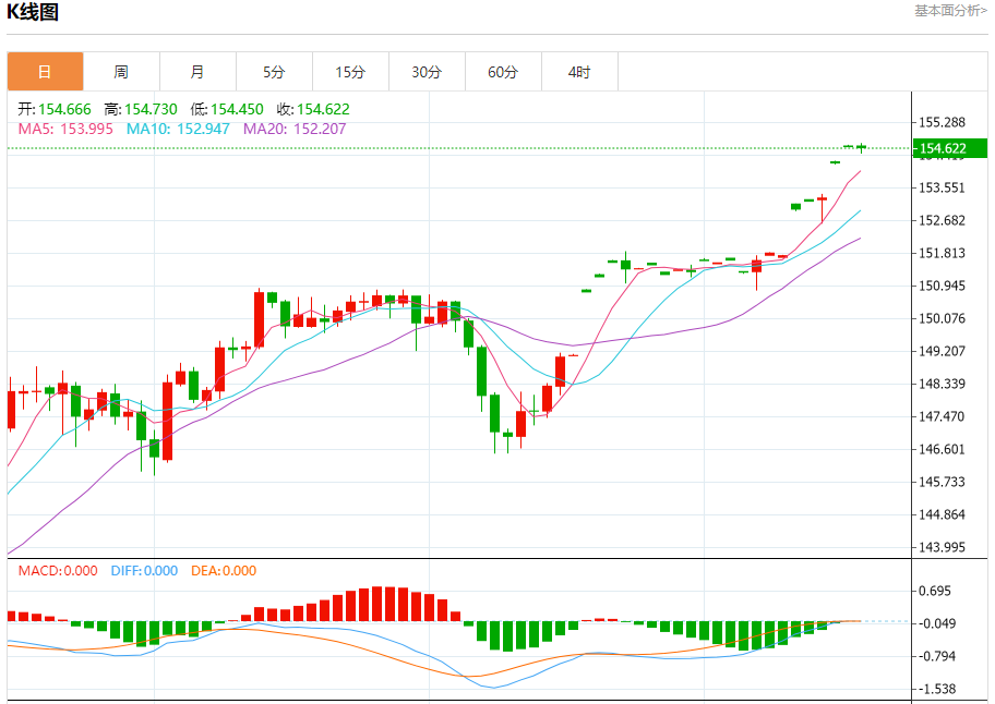 汇价高见154.730,低见154.450。上一交易日,汇价收于154.706。
