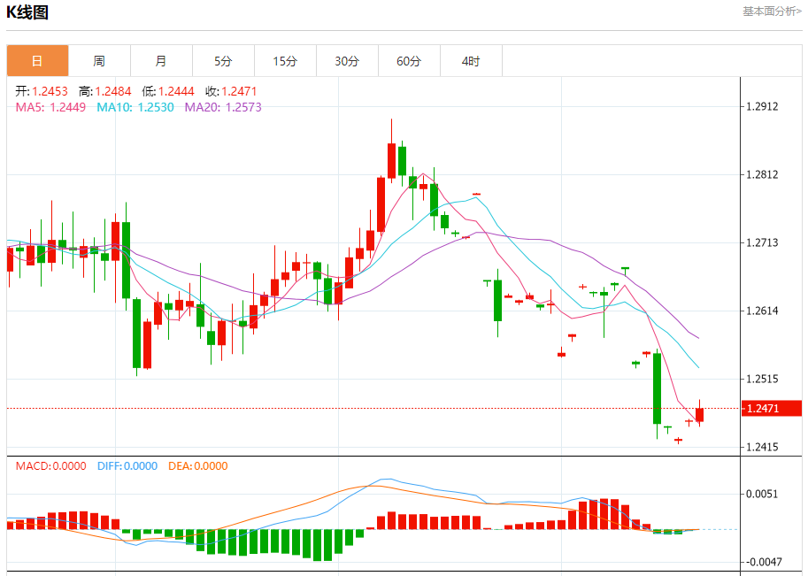 汇价高见1.2484,低见1.2444。上一交易日,汇价收于1.2453。