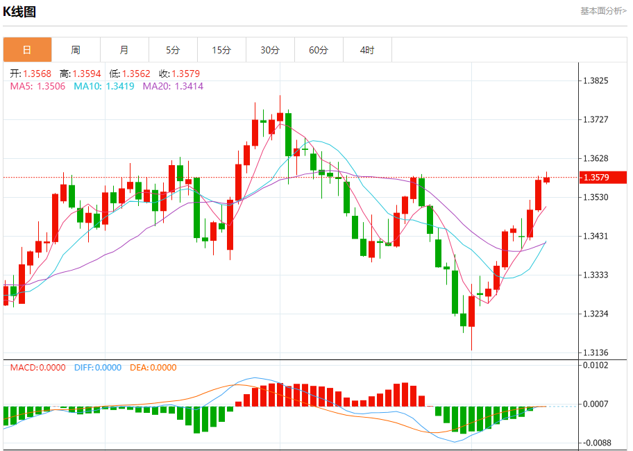 汇价高见1.3594,低见1.3563。上一交易日,汇价收于1.3573。