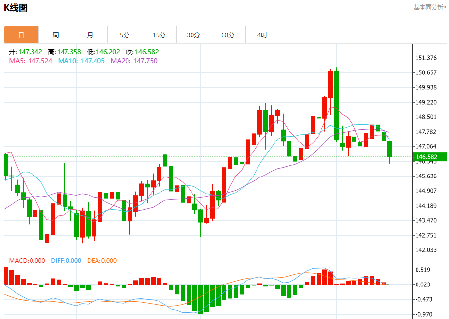汇价高见147.370,低见146.211。上一交易日,汇价收于147.371。