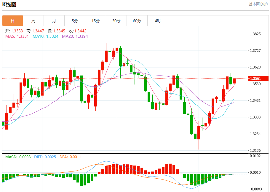 汇价高见1.3564,低见1.3525。上一交易日,汇价收于1.3529。