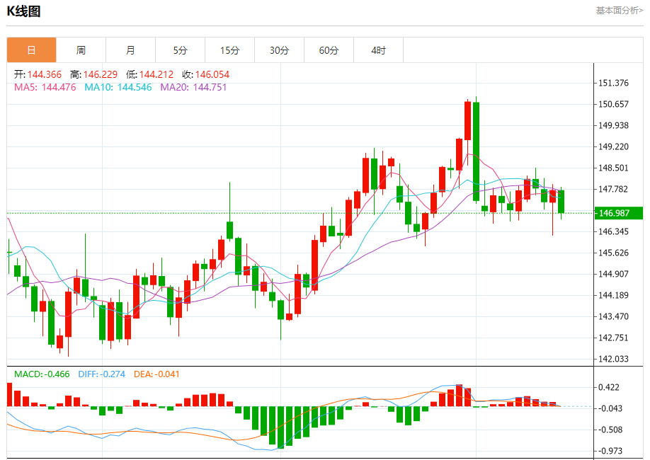 汇价高见147.855,低见146.746。上一交易日,汇价收于147.745。