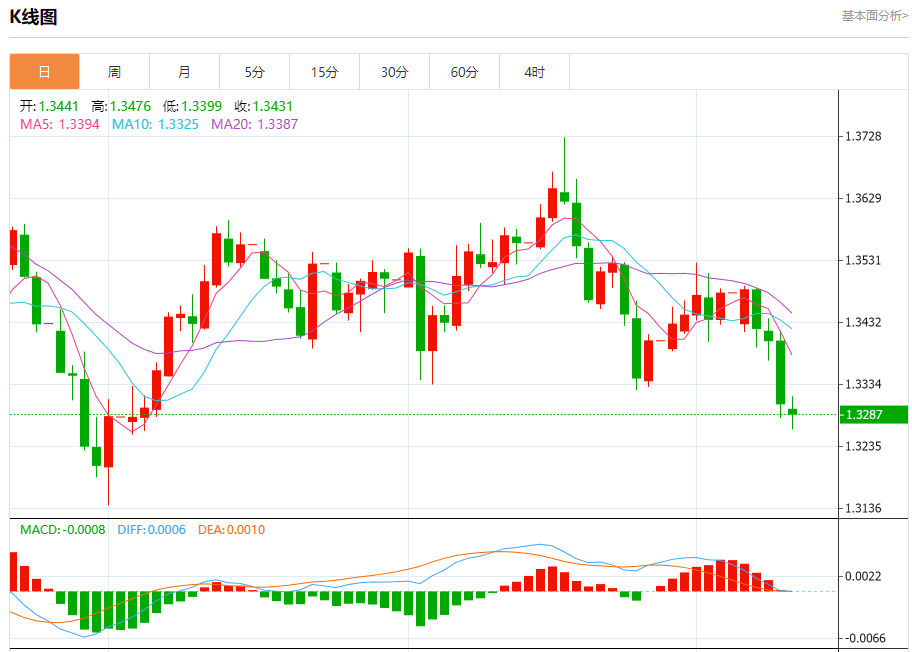 汇价高见1.3314,低见1.3262。上一交易日,汇价收于1.3303。