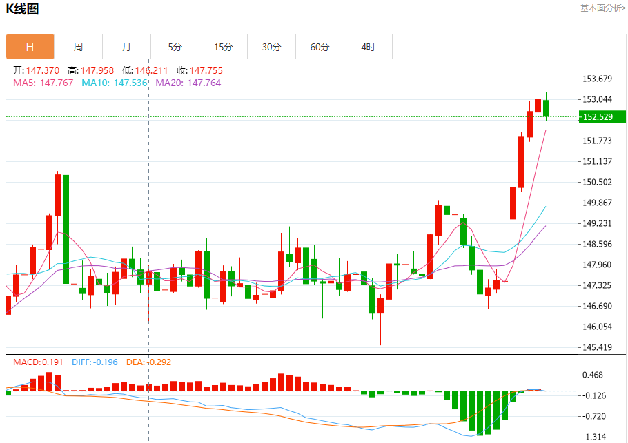 汇价高见153.271,低见152.381。上一交易日,汇价收于153.057。