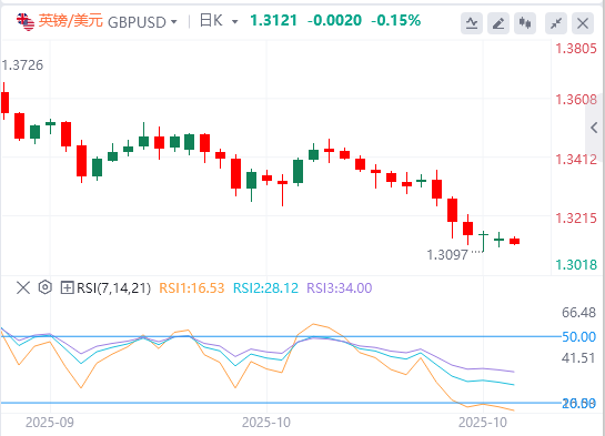 英镑/美元已跌破1.3140,若持续跌破1.31,中期内可能进一步下探至1.28。只有当英镑/美元汇率迅速反弹至1.3140-1.3150区间上方时,才能抵消此前预期的跌势。