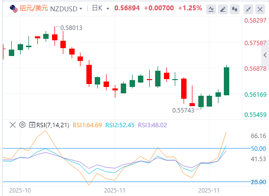 下行方面,纽元兑美元可能在关键水平0.5650获得直接支撑,随后是九日均线0.5640。若跌破该汇合支撑区,将增强空头偏向,促使货币对测试下降通道约0.5550的下限,随后是2025年4月9日记录的五年低点0.5485。
