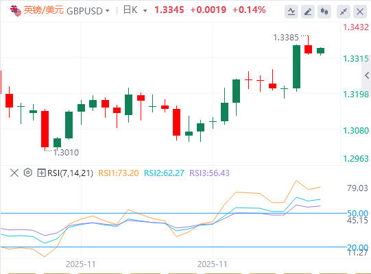 日线图中,英镑/美元交易于1.3328。该货币对守住100-EMA1.3300上方,平均线在之前的下滑后已趋于平稳,支撑更坚定的基调。价格徘徊在布林带上方1.3348附近,随着阻力带的扩大,预示波动性上升和多头压力。RSI位于61,显示出积极动能,但无超买条件。