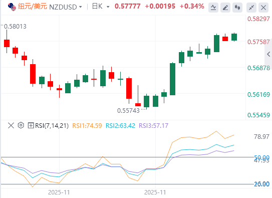 新西兰本周日程较少,但新西兰储备银行(RBNZ)的鹰派货币政策立场仍支持新西兰货币。央行在11月会议上下调了25个基点,但标志着宽松周期的结束,导致纽元相较主要同行走强。