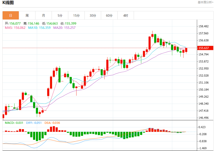 汇价高见155.652,低见154.898。上一交易日,汇价收于155.342。