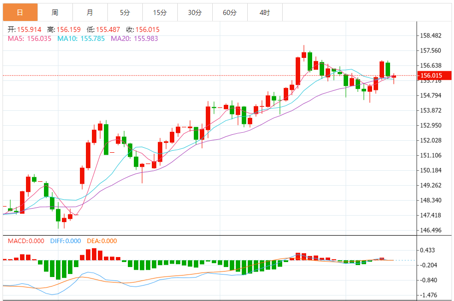汇价高见156.159,低见155.487。上一交易日,汇价收于156.002。