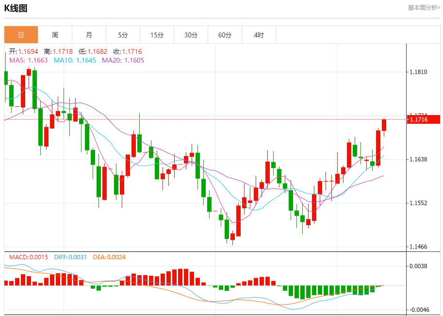 汇价高见1.1718,低见1.1682。上一交易日,汇价收于1.1694。