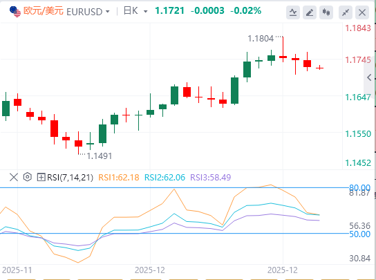 进一步下跌可能受限于九日EMA1.1713,随后是1.1700附近的下降通道边界。若跌破该支撑区,将削弱短期价格动能,并对欧元/美元汇率下行压力,测试50日均线1.1644,随后是12月1日记录的三周低点1.1589。