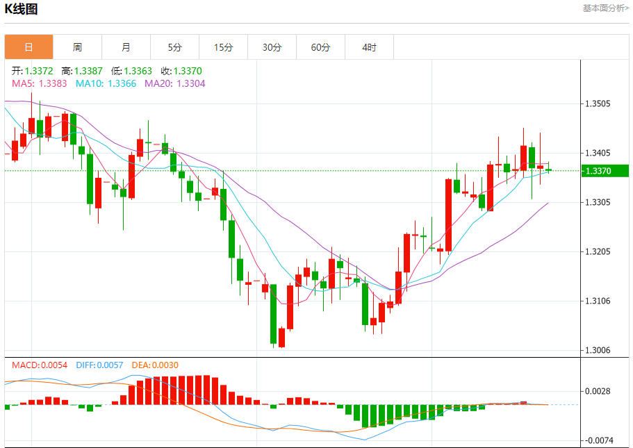 汇价高见1.3387,低见1.3362。上一交易日,汇价收于1.3379。