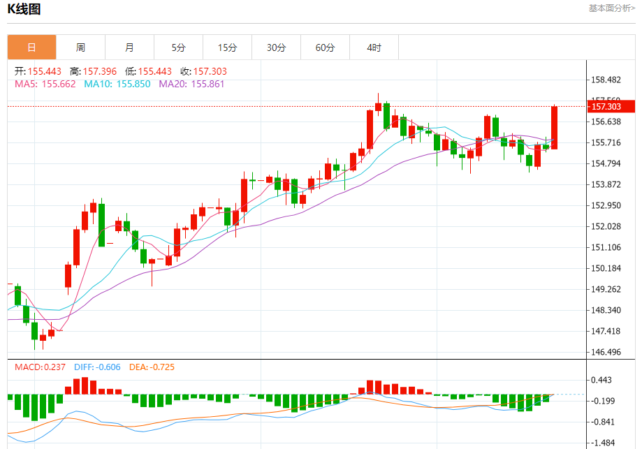 汇价高见157.384,低见155.407。上一交易日,汇价收于155.452。