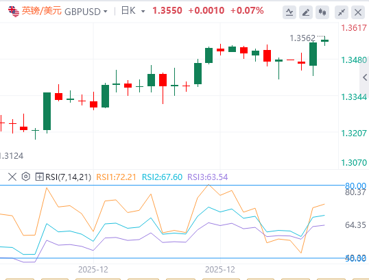 英镑兑美元在亚洲早盘时段创下三个月新高1.3562。进一步上涨可能使该货币对目标为六个月高点1.3726,随后是1.3788,为2021年10月以来最高水平。