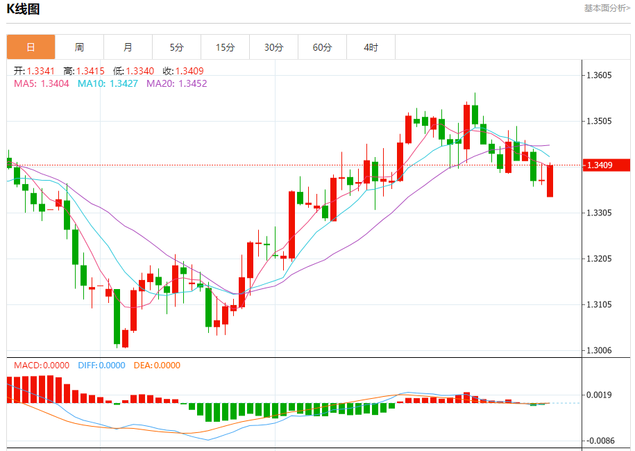 汇价高见1.3415,低见1.3340。上一交易日,汇价收于1.3377。