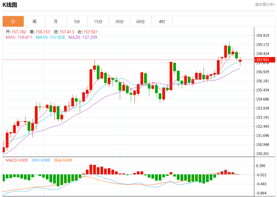 汇价高见158.153,低见157.413。上一交易日,汇价收于158.058。