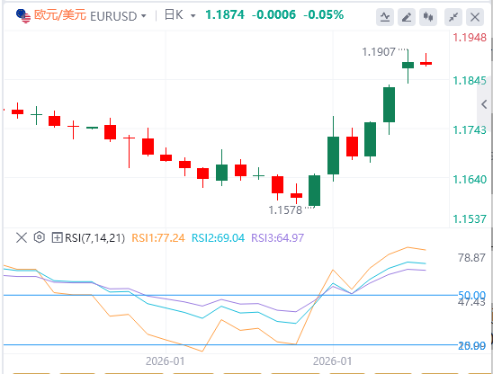 14天相对强弱指数(RSI)动量指标位于68.90下方,显示近期上涨后依然保持坚实的多头势头。