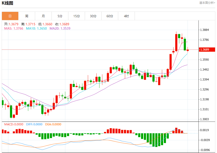 汇价高见1.3715,低见1.3660。上一交易日,汇价收于1.3685。