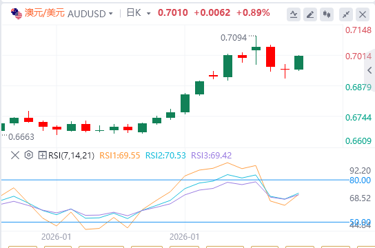 澳元/美元汇对可能反弹至0.7094,这是自2023年2月(1月29日记录)以来的最高水平。下行方面,主要支撑位于九日指数移动平均线(EMA)0.6937,其次是50日EMA0.6746。
