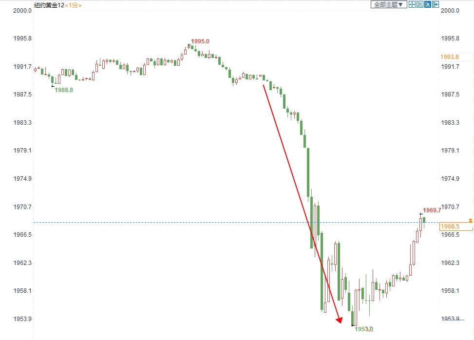 COMEX黄金期货12月合约一度刷新日内低点至1953.0美元/盎司,回吐之前逾2%的涨幅;现货黄金一度刷新日内低点至1934.00美元/盎司,跌幅约0.5%,此前日内最高涨幅为2%;