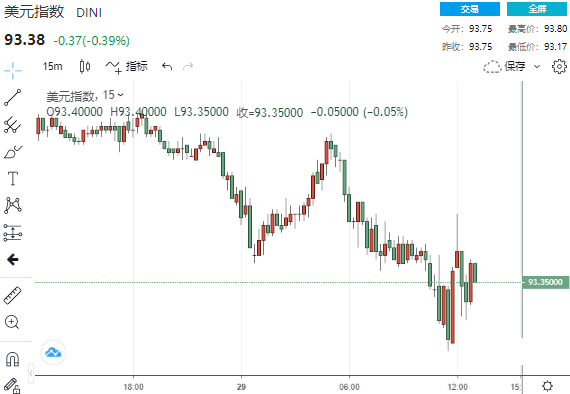 美元指数DXY在美联储主席鲍威尔发布会开始后震荡下行,并刷新日低至93.17,随后一度自低位反弹至93.53。