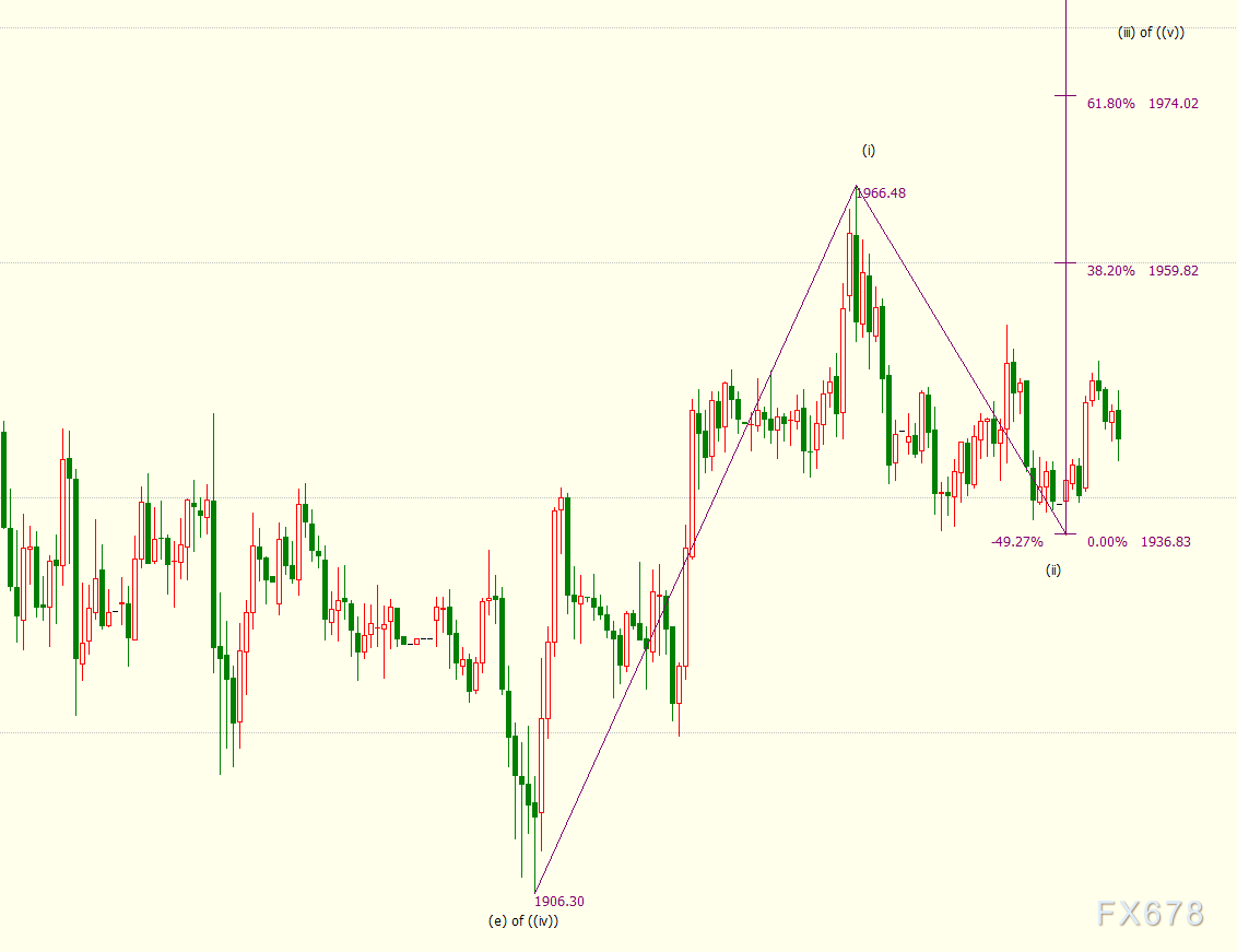 小时图上看,金价自1937美元开启动上行(iii)浪走势,(iii)浪的38.2%和61.8%目标位分别在1960美元和1974美元。(iii)浪是自1906美元开启的上行((v))浪的子浪。