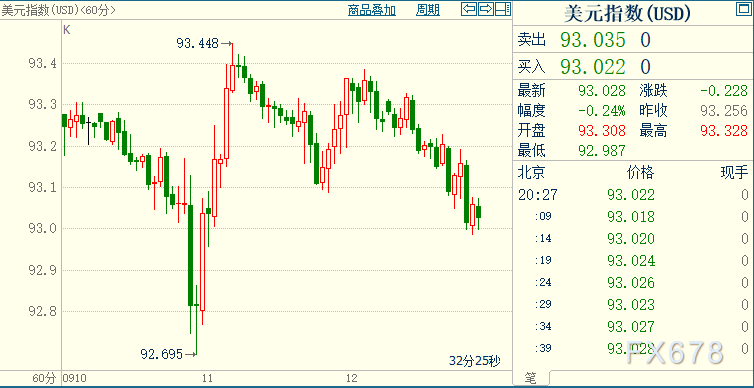北京时间20:25,现货黄金上涨0.47%至1949.52美元/盎司;COMEX期金主力合约上涨0.51%至1957.9美元/盎司;美元指数下跌0.23%至93.029。