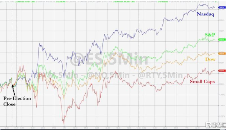 此外,在预期民主党无法夺下众议院多数席位后,金融市场也做出了反应,美股三大股指、黄金、比特币暴涨、美国十年期国债收益率暴跌、 美指也一路下行。