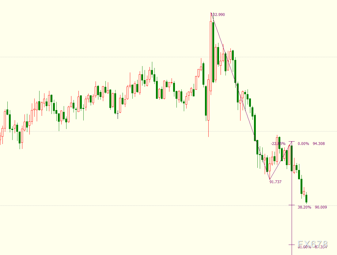 周线上看,美元指数处在自94.31开启的下行III浪中,目前逼近38.2%目标位90.01,下方支撑位看向61.8%目标位87.35。III浪是自102.99开启的下行(C)浪的子浪。日线上看,美元指数若在90整数关口附近得到支撑,短线反弹目标位上看12月7日高点91.20。