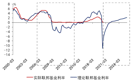伯南克规则是对于泰勒规则的修改。泰勒规则由学者约翰·泰勒所提出该规则认为央行制定的名义利率应该与通胀和通胀目标的差值、产出缺口相关。之后伯南克对泰勒规则进行了修正。一是赋予产出缺口更高的权重二是用个人消费支出物价指数(PCE)来衡量通胀水平。在计算理论的联邦基金利率时核心PCE与产出缺口是必要的数据伯南克采用当时时间节点上所能得到的预测值替代了当前已知的的实际值。图5展示了我们基于文献与数据自行计算的伯南克规则下的理论联邦基金利率。在次贷危机期间理论联邦基金利率保持了长期的负值在该时间段内美联储维持了0利率第一次加息是在2015年年底这与图中的曲线所吻合理论联邦利率就是在该时间段由负转正这展示了这个法则的预判能力。对于这次新冠疫情带来的经济危机我们发现理论联邦基金利率在新冠疫情期间急速下跌进入负值但是之后的恢复非常迅速该指标会在2022年1季度回复到正值因此基于这个法则我们预测美联储将于2021年年底至2022年年初进行第1次加息这与之前的分析非常接近。