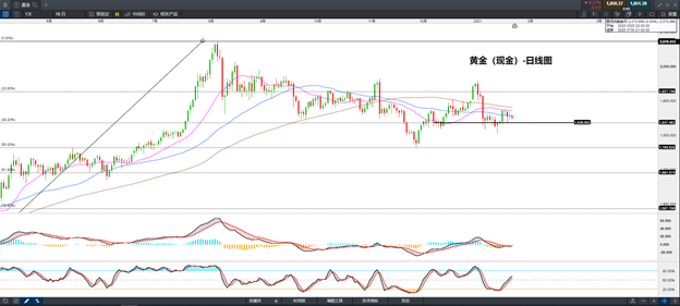 黄金日线图显示出明显的上行承压受到多重均线压力但随机震荡指标仍然走在上行趋势中 金价难以在近期出现较大的突破行情可能出现窄盘整理形态.最近的下方潜在支持在1837附近 上方潜在阻力首看20日均线1871左右位置 只有突破才有机会重新打开上行空间.