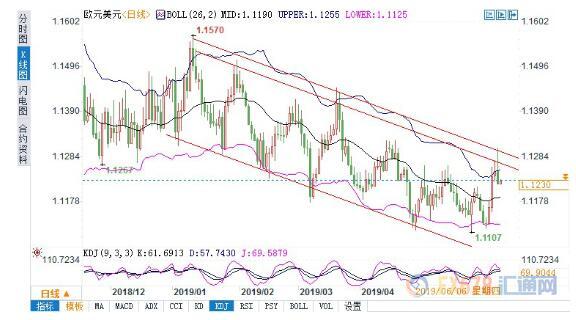从日线图来看,欧元兑美元价格从2019年1月上旬步入下行通道,5个月来多次触及通道上下轨,确认下行通道稳固。6月5日欧元兑美元再次冲高回落,未能成功突破通道上轨。KDJ指标出现拐头迹象,向上动力不足,后市可能转为长线震荡下跌,短期下方支撑位在布林带中轨1.1190附近。